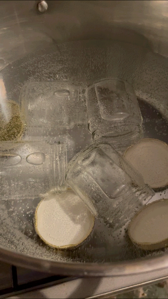 Comme je n’ai pas de stérilisateur, je fait bouillir une marmite d’eau et y plonge bocaux et couvercles quelques minutes.